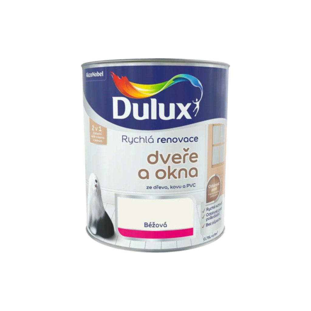 Dulux Rychlá renovace – Okna a dveře Dulux Rychlá renovace Okna a dveře je moderní vodou ředitelný nátěr určený pro rychlou a efektivní obnovu oken, dveří a dalších namáhaných povrchů. Speciálně vyvinutá receptura kombinuje základní i vrchní nátěr v jednom kroku, čímž výrazně šetří čas i náklady na práci. Barva je vhodná pro dřevo, plast i kov (mimo čerstvý pozink) a lze ji použít v interiéru i exteriéru. Vytváří odolný ochranný film s vysokou kryvostí, který odolává UV záření, vlhkosti i mechanickému namáhání. Díky technologii Anti-Blocking se natřené plochy po zaschnutí neslepují, což je klíčové zejména u okenních rámů a dveřních křídel. Rychlé schnutí umožňuje snadnou a plynulou renovaci bez zbytečných prostojů. Klíčové vlastnosti Univerzální použití na dřevo, plast i kov (interiér i exteriér) Základní a vrchní nátěr v jednom kroku Anti-Blocking technologie proti slepování natřených ploch Vysoká odolnost proti poškrábání, otěru a povětrnostním vlivům Rychlé schnutí – na dotek suchý přibližně po 1 hodině Druhá vrstva možná po cca 6 hodinách Vysoká kryvost a výdatnost až 12 m²/l Odolnost proti UV záření, barvy dlouhodobě neblednou Použití Podklad musí být čistý, suchý, odmaštěný a zbavený nesoudržných nátěr Povrch před aplikací lehce obruste a odstraňte prach Nanášejte štětcem se syntetickým vláknem nebo válečkem s krátkým chlupem Obvykle aplikujte 2 vrstvy, u výrazných barevných rozdílů doporučeny 3 vrstvy Optimální aplikační podmínky: teplota +10 až +28 °C, relativní vlhkost vzduchu do 80 % Doporučené podklady Dřevo – okna, dveře, rámy, zárubně Kov – železo, hliník a již natřené kovy (nevhodné na čerstvý pozink) Plast – PVC okenní rámy a plastové doplňky